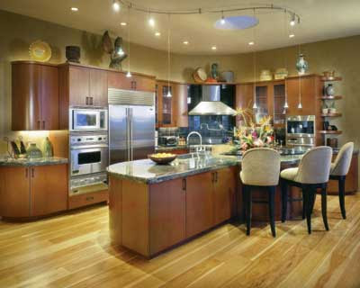 Cabinets and shelving rounded against the walls recall the sleek style of Art Deco, but there's nothing retro about the overall effect. Artfully arranged lights, some recessed, some on a curved track, add even more glamorous sparkle.